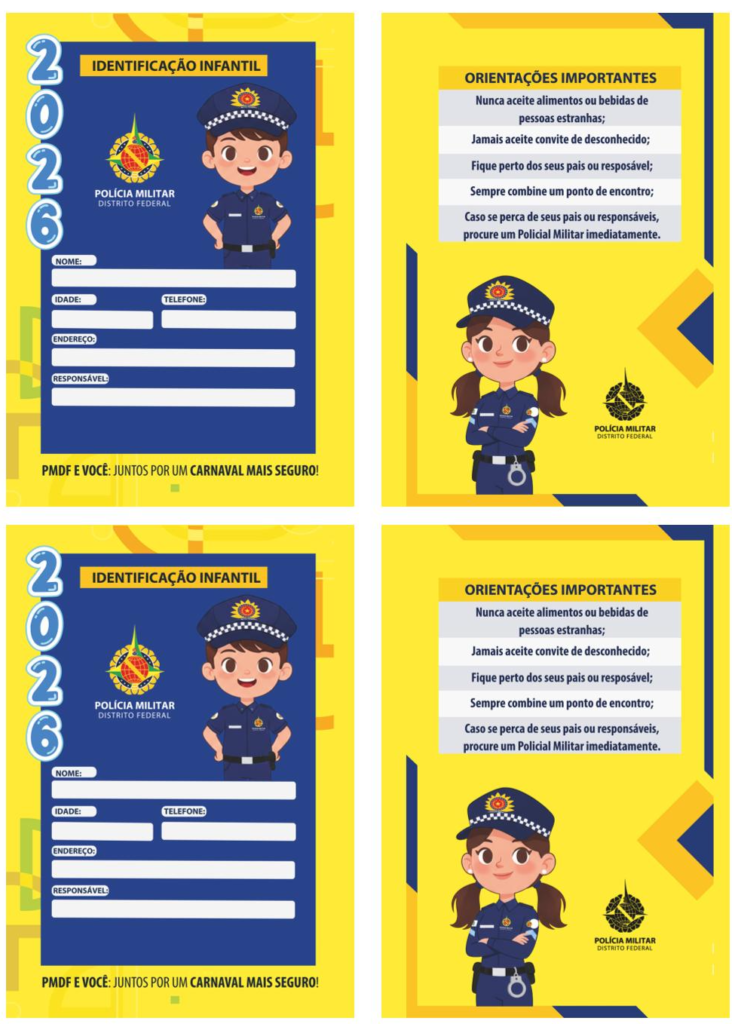 A tradicional campanha de identificação infantil da Polícia Militar do Distrito Federal (PMDF) retorna no Carnaval de 2026 como uma medida essencial para evitar desaparecimentos e garantir a segurança dos pequenos foliões. A principal orientação é que os responsáveis registrem as crianças utilizando a Carteirinha de Identificação Infantil, que pode ser impressa neste site e anexada à roupa ou utilizada como crachá. O documento contém o nome da criança e o telefone de contato dos responsáveis. Além das carteirinhas, a PMDF estará em pontos estratégicos de blocos voltados ao público infantil, reforçando a identificação das crianças por meio de pulseiras. A orientação é nunca deixar as crianças desacompanhadas, além de instruí-las a procurar os postos policiais caso se percam.